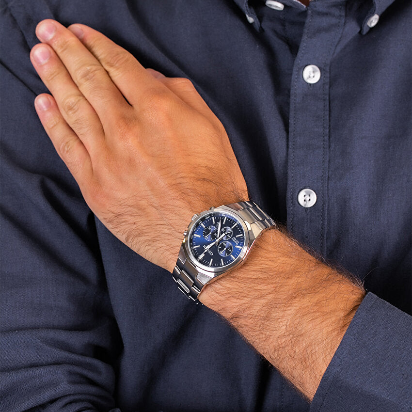 The blue dial, a canvas of timekeeping artistry, is punctuated by luminous silver-tone hands and index hour markers. It’s not just a feast for the eyes it’s a utilitarian masterpiece. Minute markers and tachymeter markings along the outer rim ensure precision in both time and speed measurement. Let’s not forget the convenience of a date display strategically placed between the 4 and 5 o’clock positions. The luminescent hands and markers ensure you’ll never miss a beat, even in the dimmest of light.
