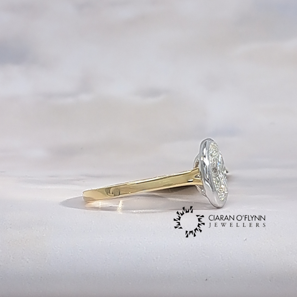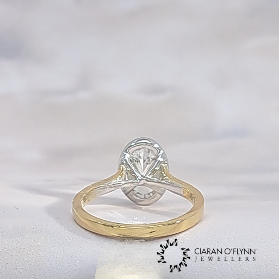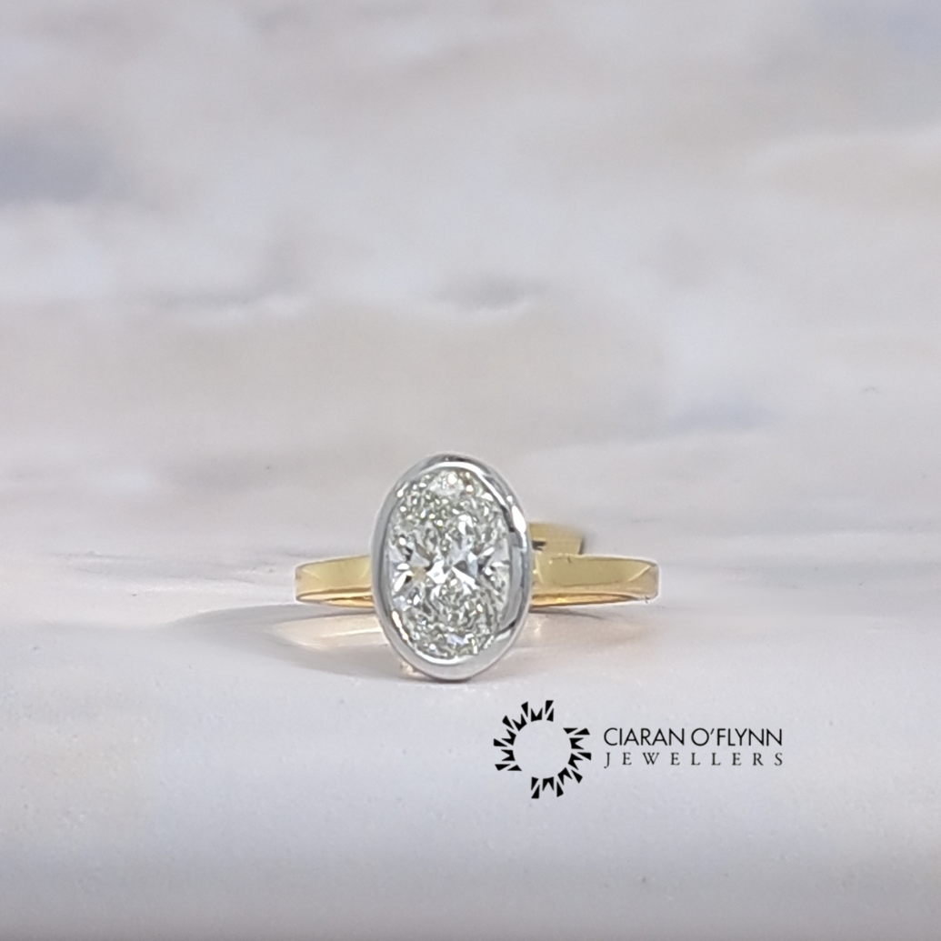 Regular price €3.000,00This 18ct Yellow Gold Lab Grown Diamond Oval Solitaire Engagement Ring is a refined expression of modern luxury and timeless romance. At its centre sits a stunning 2.03ct oval-cut lab grown diamond, securely set in a sleek bezel of contrasting 18ct white gold. The clean lines of the bezel setting enhance the diamond’s brilliance while offering a contemporary aesthetic and added protection for everyday wear.
