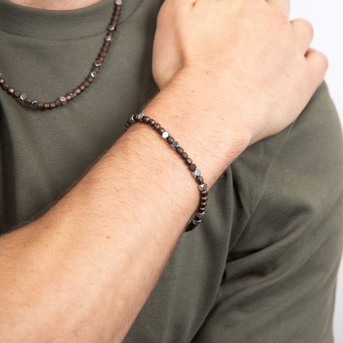 Regular price €49,00Inspired by the rugged beauty of natural rock formations, this bracelet blends earthy textures with contemporary edge, featuring brown hematite beads and stainless steel accents for a raw yet refined look. The deep, natural tones of hematite symbolise strength and grounding, while the sleek steel elements add a modern contrast. This versatile piece can be worn alone for effortless sophistication or paired with the matching necklace for a cohesive, adventurous look.