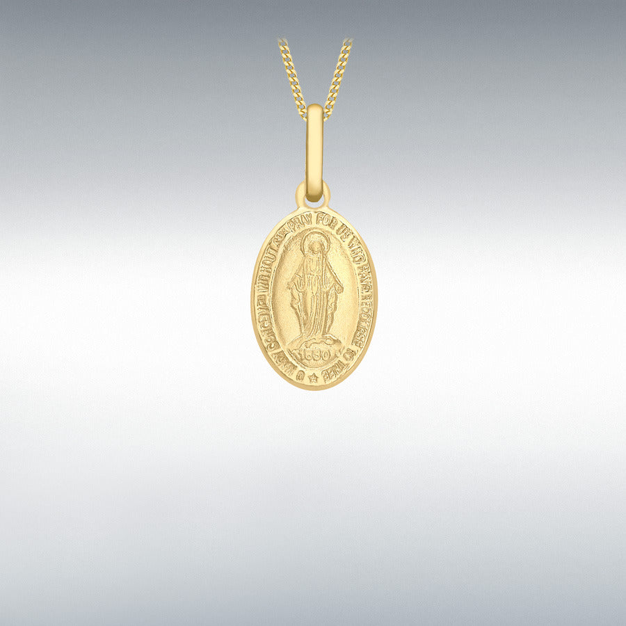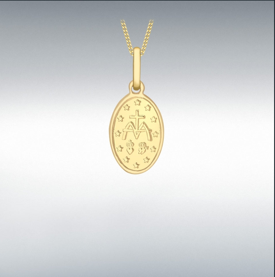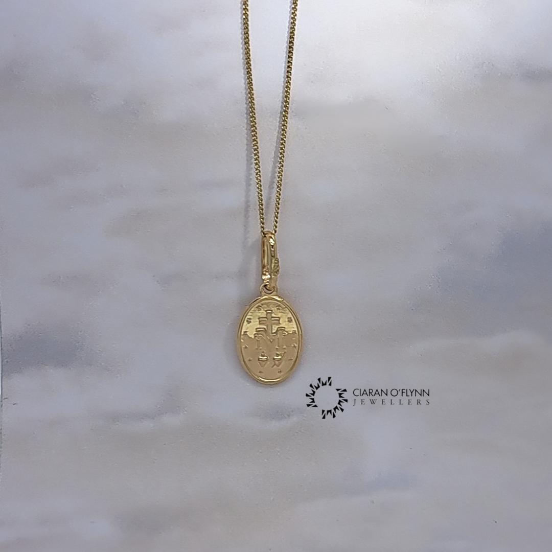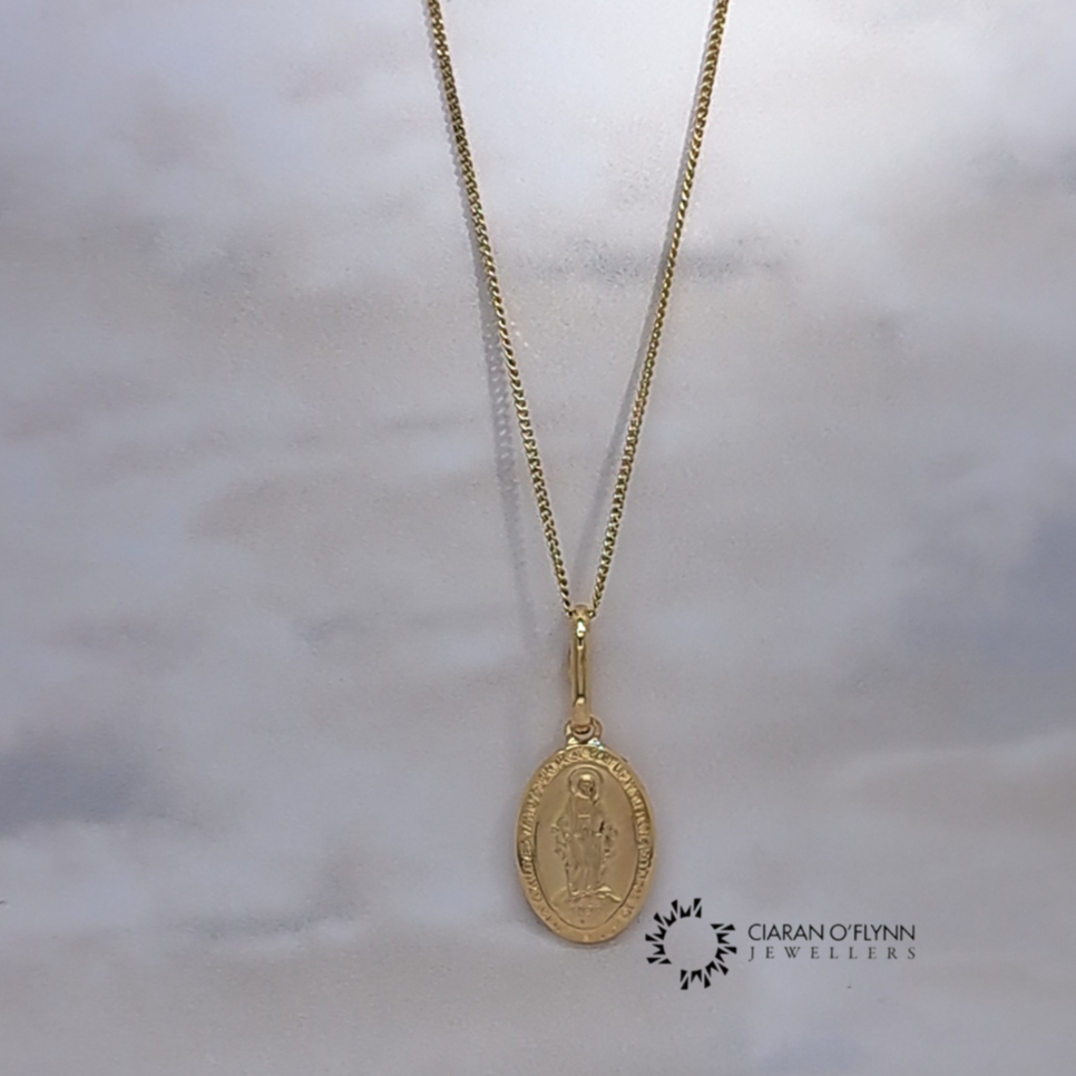 Celebrate faith and craftsmanship with this beautifully designed 9ct Yellow Gold Holy Mary Oval Reversible Pendant from Ciaran O Flynn Jewellers.