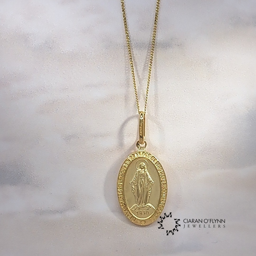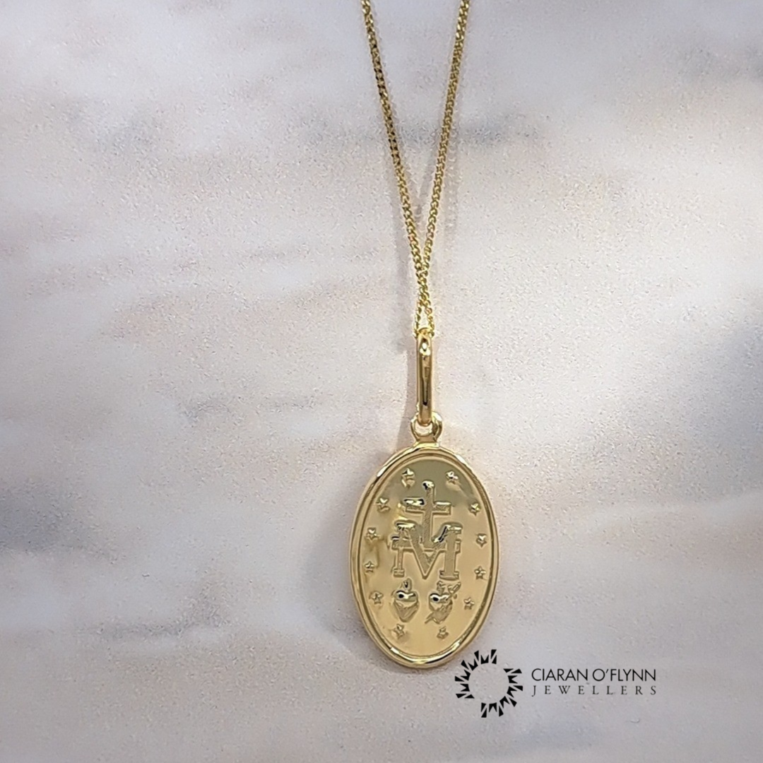 Regular price €0,00Celebrate faith and devotion with this 9ct Yellow Gold ‘Holy Mary’ Oval Reversible Pendant from Ciaran O Flynn Jewellers.