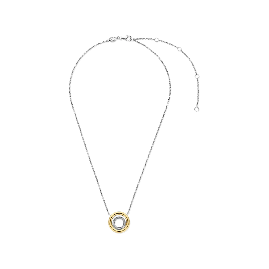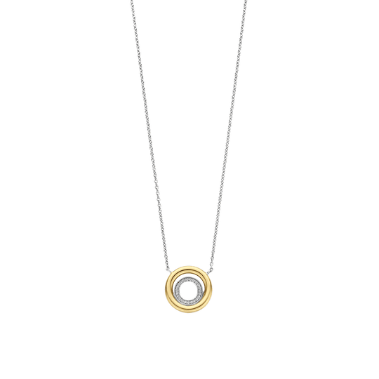 Regular price €129,00Elevate every moment with this TI SENTO gold-plated silver Necklace 34105ZY. Crafted from premium 925 sterling silver, the necklace features a sleek golden circle framing a pavé-set silver centre. This clean, architectural composition draws the eye inward, creating a mesmerising play of light and contrast. The yellow gold plating adds warmth and depth, while the platinum-plated pavé accent introduces brilliance and refinement. Suspended from a delicate silver chain, the pendant sits elegantly at the collarbone—ideal for layered looks or worn solo as a sculptural statement. This necklace celebrates unity and balance in a contemporary key. Whether styled with a silk blouse or casual knit, it adds polish and symbolism to any outfit. Nickel-free and hypoallergenic, it offers lasting comfort and premium quality, day to night.