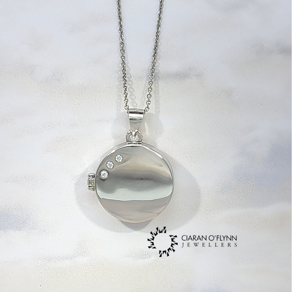 Sterling Silver round Locket with 3 Cubic Zirconias | Ciaran O Flynn