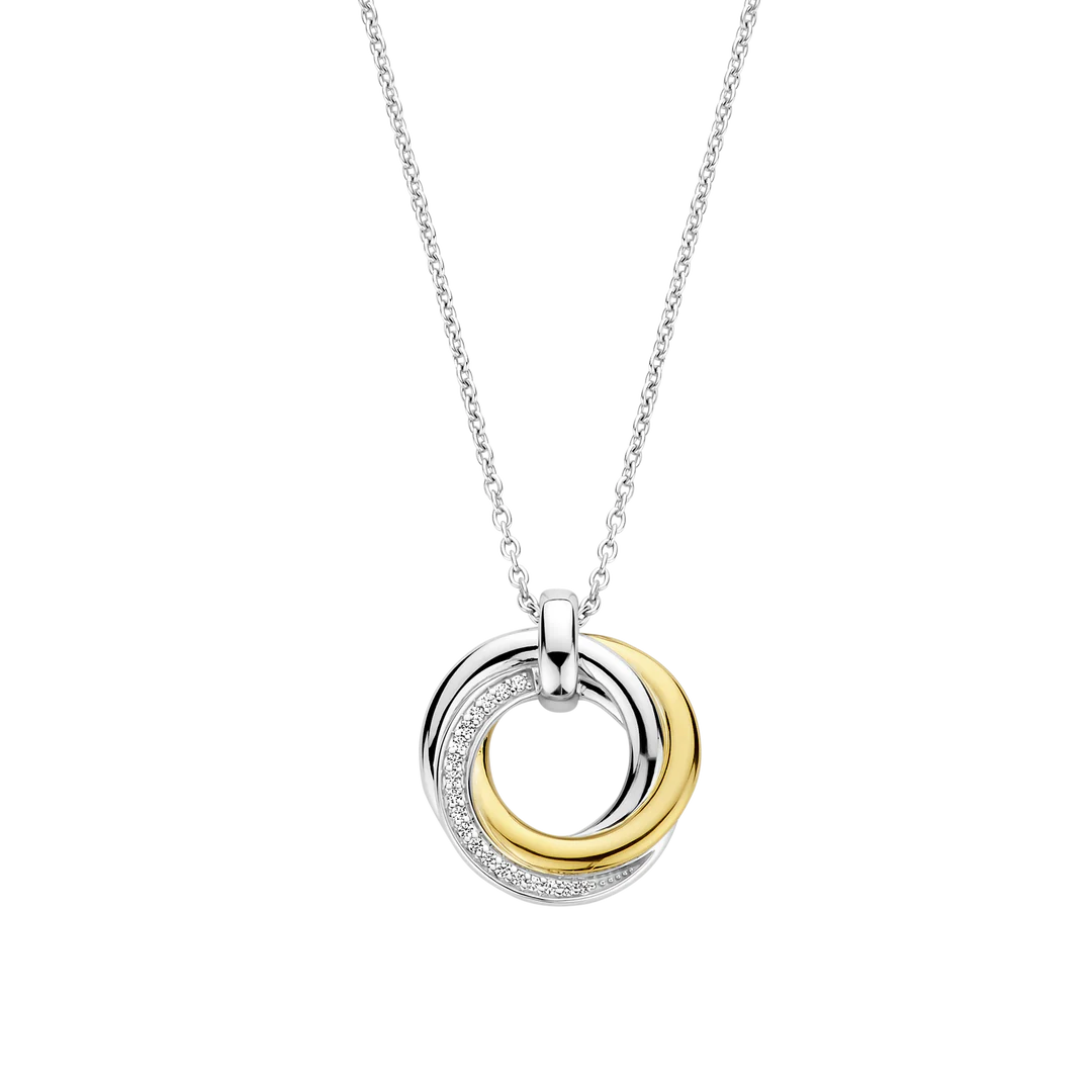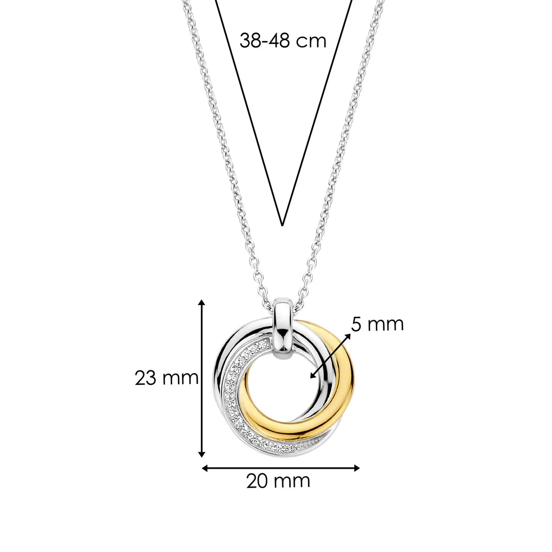 Indulge in the captivating interplay of textures with this TI SENTO gold-plated silver Necklace 34055ZY/42. Crafted from 925 sterling silver and plated with platinum for enduring brilliance, this statement piece features a large circular design composed of intertwined layers. Some layers are plated in lustrous yellow gold, creating a warm contrast against the cool silver of the rest. The intricate details and the contrasting textures make this necklace a true work of art. It's a perfect fusion of modern design and timeless elegance. Add that touch of escapism to your life and amp up your everyday look with this exceptional piece. Wear it alone for a bold statement or layered with other TI SENTO necklaces for a personalised touch. Crafted with care for sensitive skin, this nickel-free and hypoallergenic ring ensures lasting comfort and quality.