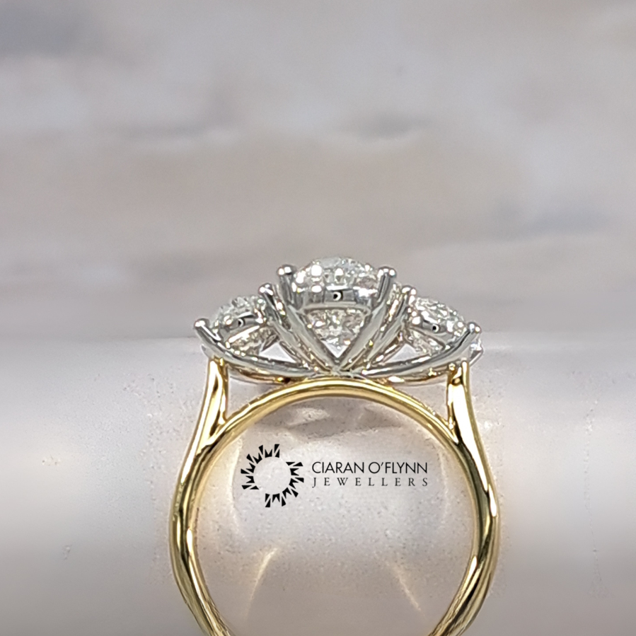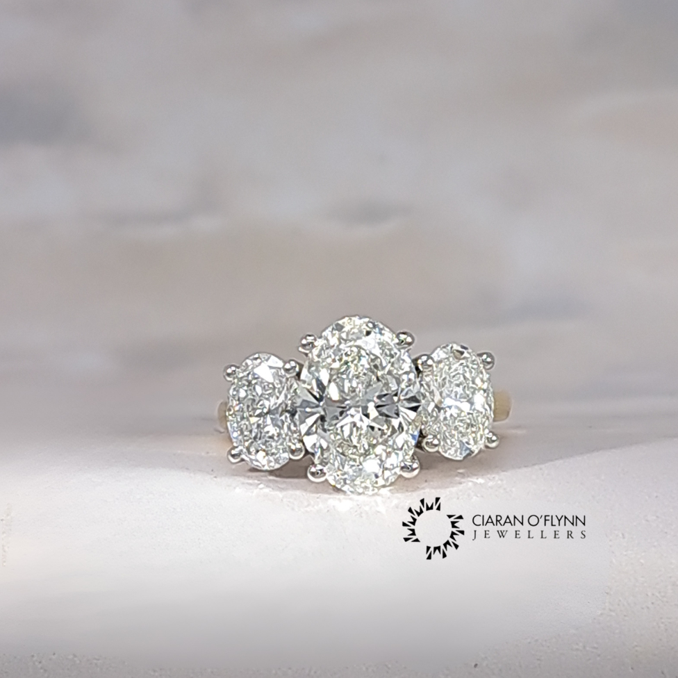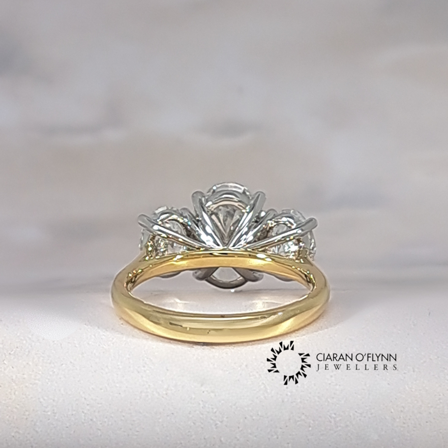 5.12ct oval lab grown diamond trilogy engagement ring in 18ct yellow gold