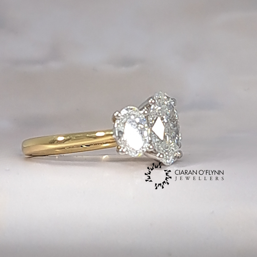 side view of 18ct yellow gold trilogy engagement ring with 3 oval diamonds