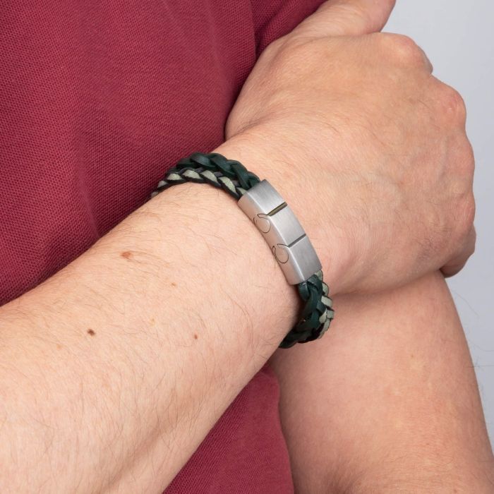 Taking inspiration from the tranquillity of nature, this braided leather bracelet captures the spirit of the wild with its two tone green leather and rugged double-braided design. Reflecting the strength of nature, this piece is secured with a sleek yet durable stainless steel clasp. A versatile accessory for those who embrace adventure, it’s perfect for adding a touch of the outdoors to any look.